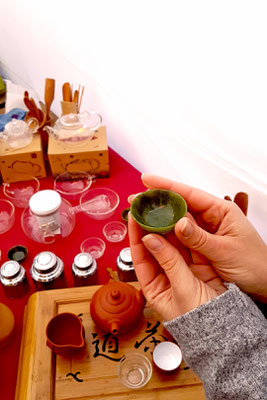 Das Festival fand in den großzügigen Räumlichkeiten der Heilig-Kreuz-Kirche in Kreuzberg statt. Gleich am Anfang gelang den Veranstaltern ein kluger Kniff. Mit der Eintrittskarte gab es für jeden Besucher einen kleinen Teebecher mit dem man jederzeit umweltfreundlich und vor allem hygienisch Tee und Wasser konsumieren konnte. Aber bevor ich mich an die Verkostung machte, dachte ich an etwas ganz anderes: Den Secondhand Teewaren-Markt. Dieser fand in den Außenräumen der Kirche statt. Dies war ein etwas kaltes Unterfangen, denn ich hatte meinen Mantel an der Garderobe abgegeben. Doch meine Neugierde wurde sofort belohnt. Auf den ersten Blick fand ich eine wunderschöne Chawan, eine japanische Teeschale, für die Zubereitung und den Genuss von Matcha. So hatte ich mein Ziel, eine neue Chawan zu finden, schon in den ersten Minuten erreicht. Auf diese Weise konnte der Tag weiter gehen!
