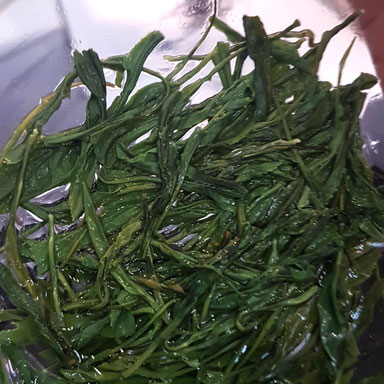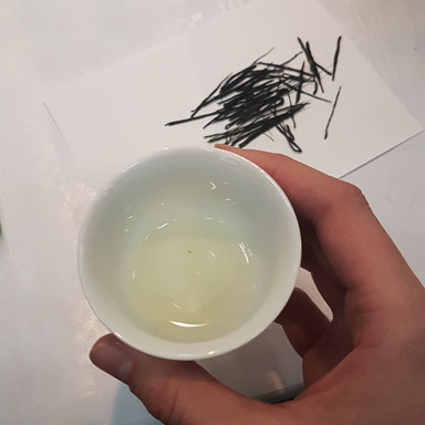 Auch an der Optik der Nadeln war sofort zu erkennen, dass es sich hierbei um einen ganz besonderen Sencha handelt. Sie waren ungewöhnlich lang und dünn. Der erste Aufguss enthielt nur einen Hauch von Farbe, war allerdings beim Nippen eine unerwartete Geschmacksexplosion!