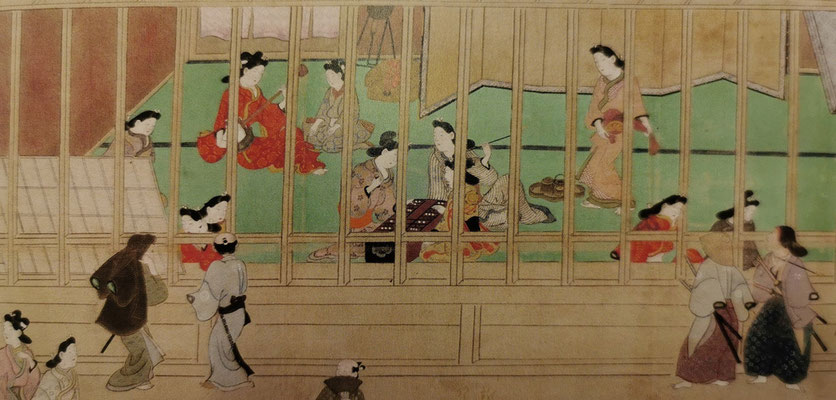 Allerdings waren die repräsentativsten Farbe des Zeitalters weder rosa noch blau, sondern es waren Braun- und Grautöne. Braun wurde mitunter von den Kabuki-Spielern, welche als Idole des Volkes bezeichnet wurden, getragen. Braun und Grau waren die Farben des Volkes selbst. Durch diese farbliche Einschränkung inspiriert, wurden außerdem eine Vielfalt an grauen und braunen Farbschattierungen durch die Färber entwickelt, welche wieder die Kreativität der Japaner unterstreicht, aus der Not eine Tugend zu machen.